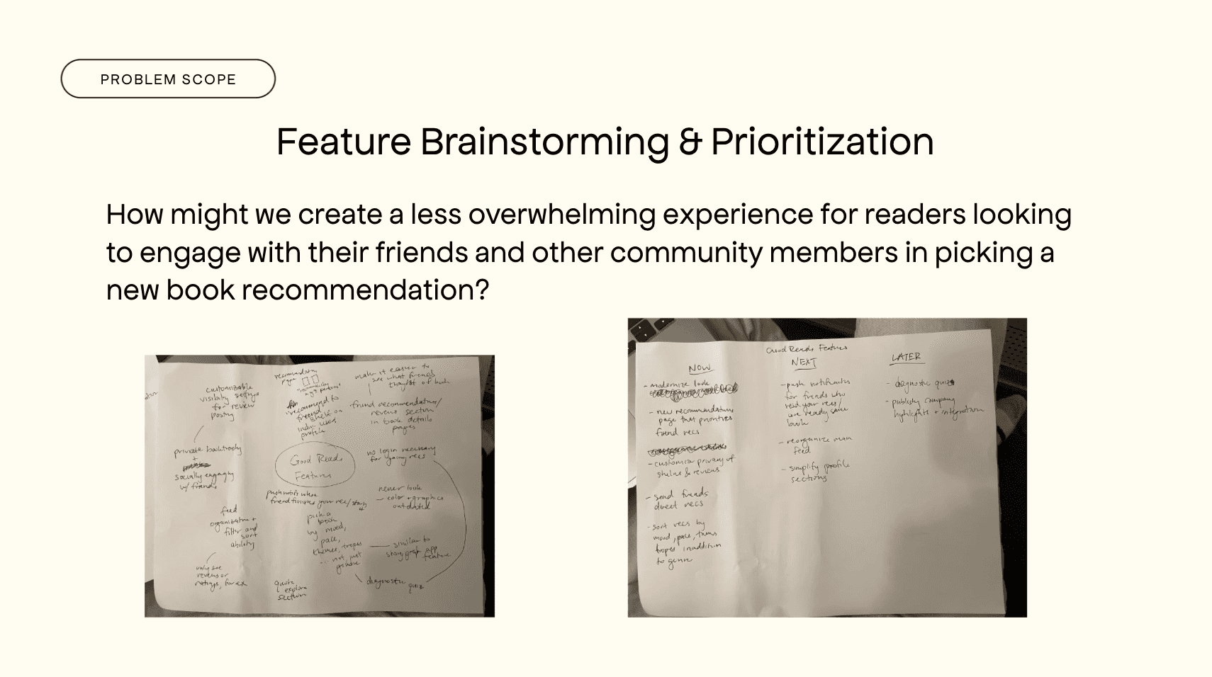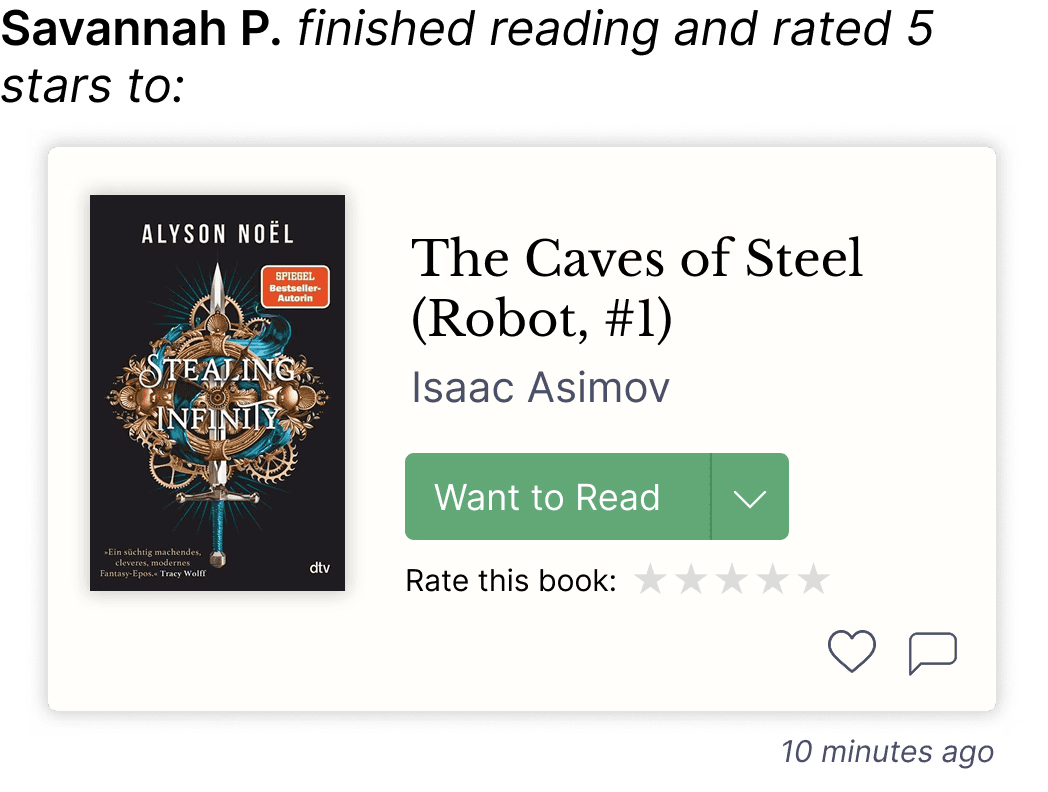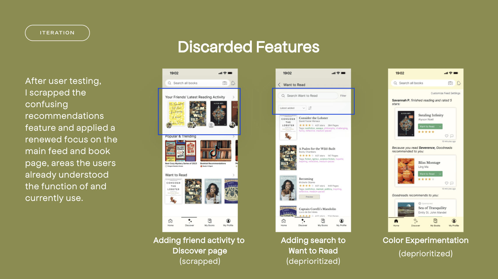 In user interviews, 5 of 5 users used the main feed to find new books and cited friends as a main source of book recommendations. Meanwhile, 60 percent of users mentioned that the main feed was poorly organized.